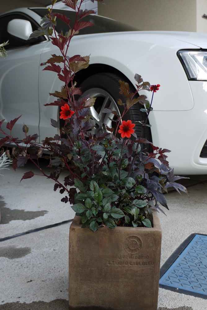 前回書いたダークカラーの寄せ植え。プチダリアが咲いたから写真を撮りました。